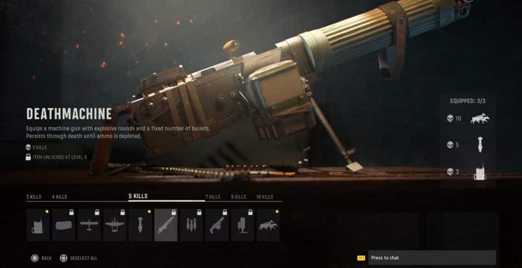 The Deathmachine returns as a devastating 5-kill portable weapon with persistent ammunition across respawns. This heavy machine gun features explosive rounds for enhanced area damage.Unlike previous iterations, Vanguard’s Deathmachine continues between lives until ammunition depletion. The explosive rounds create wider damage cones but risk self-harm at close ranges.Advanced technique: Deploy the Deathmachine when anticipating multiple engagements. The persistence allows aggressive play without worrying about losing the investment upon death.