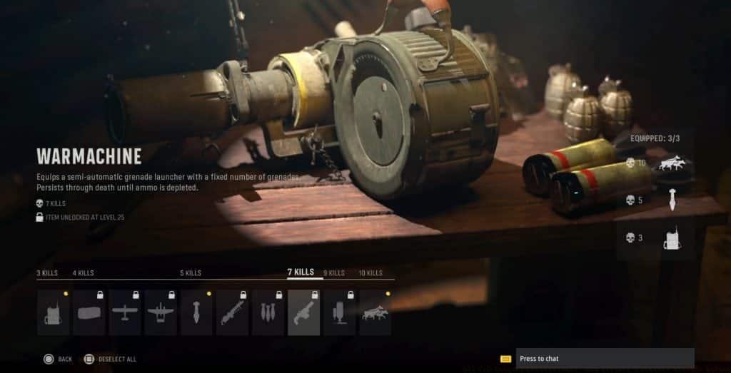 The Warmachine grenade launcher returns at 7 kills with persistent ammunition across respawns. This explosive weapon provides sustained area denial and objective control.Similar to the Deathmachine, the Warmachine continues between lives until all grenades are expended. This persistence makes it valuable for extended objective pressure.Common mistake: Wasting Warmachine grenades on single targets. The explosive nature makes it most effective against groups or objective areas where multiple enemies congregate.