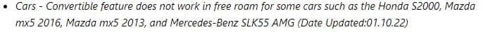 The official “Won’t Fix” designation specifically identifies four problematic vehicles: the Honda S2000, Mazda MX-5 2016, Mazda MX-5 2013, and Mercedes-Benz SLK55 AMG. These models consistently fail to respond to convertible top commands during free roam sessions, despite identical functionality working flawlessly in garage-based ForzaVista mode.