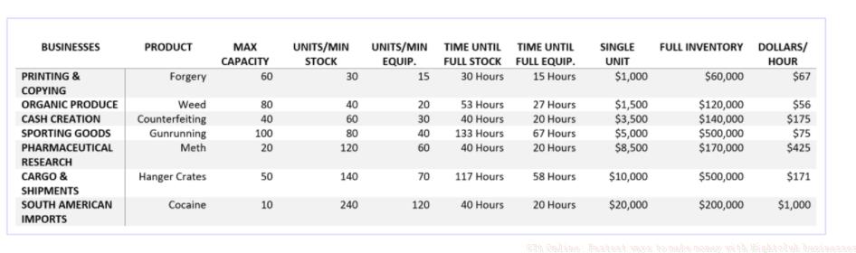 Beyond the passive popularity income, your nightclub serves as a hub for multiple illegal business ventures operating simultaneously. Each business type offers different profit margins and completion times, allowing for strategic selection based on your current financial needs and available playtime.