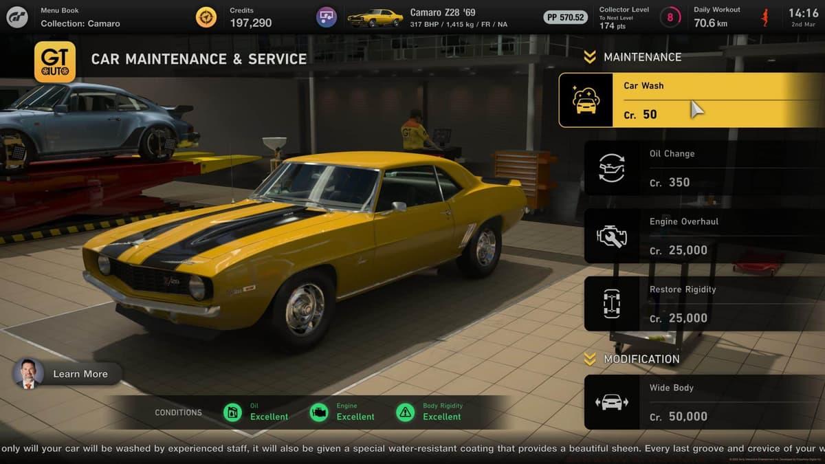 The vehicle cleaning system within GT Auto provides straightforward visual restoration.Locate the Maintenance & Servicing department specifically to access washing capabilities. Each cleaning session requires a nominal investment of 50 Credits, making it accessible throughout your gaming journey.