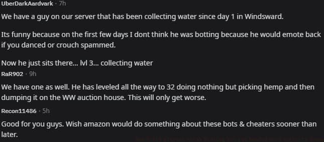 While the trapped bot scenario generated amusement, it highlighted a serious systemic issue affecting multiple servers. Community responses to the Reddit post revealed widespread botting activity across different regions. User ‘RaR902’ reported, “He has leveled all the way to 32 doing nothing but picking hemp and then dumping it on the [Windsward] auction house. This will only get worse.” Another player, ‘UberDarkAardvark,’ described a character “collecting water since day 1 in Windsward,” noting behavioral changes from interactive to fully automated. These accounts demonstrate how bots progress from mimicking human behavior to operating with mechanical precision, often leveling up solely through repetitive gathering actions.