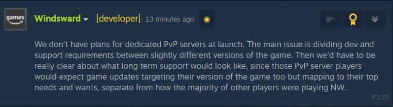 A development team member from Amazon Games’ New World project, known as Windsward, officially stated through Steam communications that “dedicated PvP servers remain outside our launch strategy,” explaining the core challenge involves “allocating development and technical support across multiple game variations.”