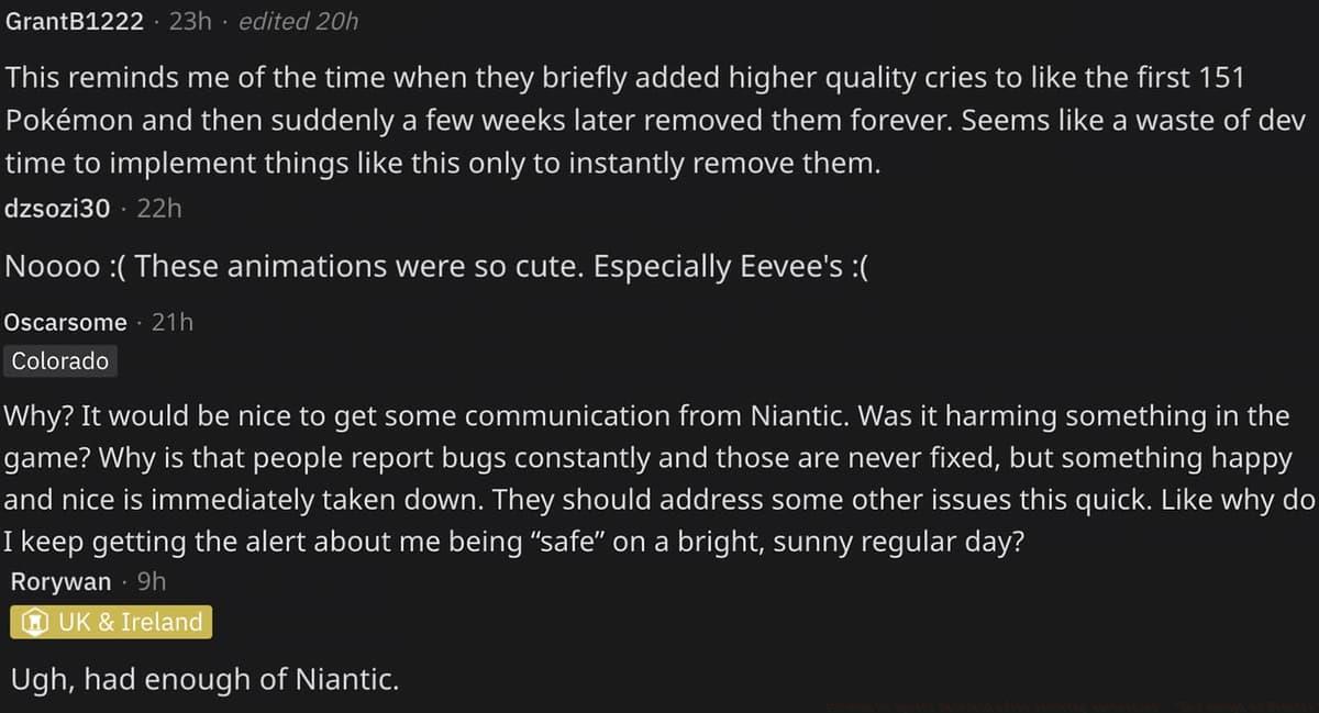 Another community member expressed particular sadness about Eevee’s removal: “These animations added so much personality, especially Eevee’s delightful dance moves.” This comment referenced the August Community Days where the Generation I Pokemon performed its celebratory animation during every wild encounter.