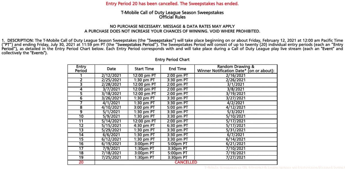 ActivisionNYSL Major 5 intro screen. Beyond visual elements, the partnership termination affected active consumer engagement programs. The CDL’s weekly T-Mobile sweepstakes program was abruptly canceled according to official FAQ updates, with the final period marked as terminated and the entire promotion declared ended. This represents a significant operational shift beyond mere branding removal.